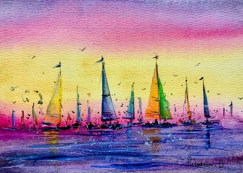 Tablou Amurg pe apa, pictat manual in acuarela, 24x32cm