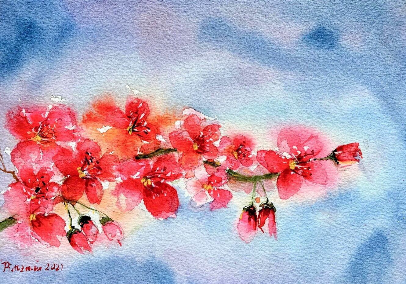 Tablou Inflorire albastra, pictat manual in acuarela, 20x20cm