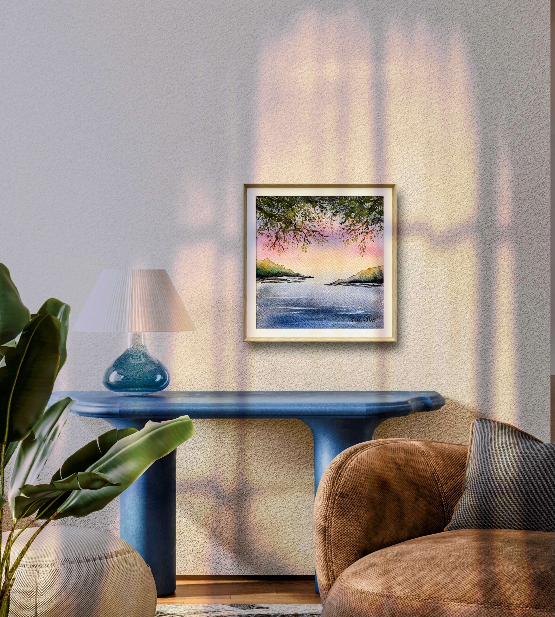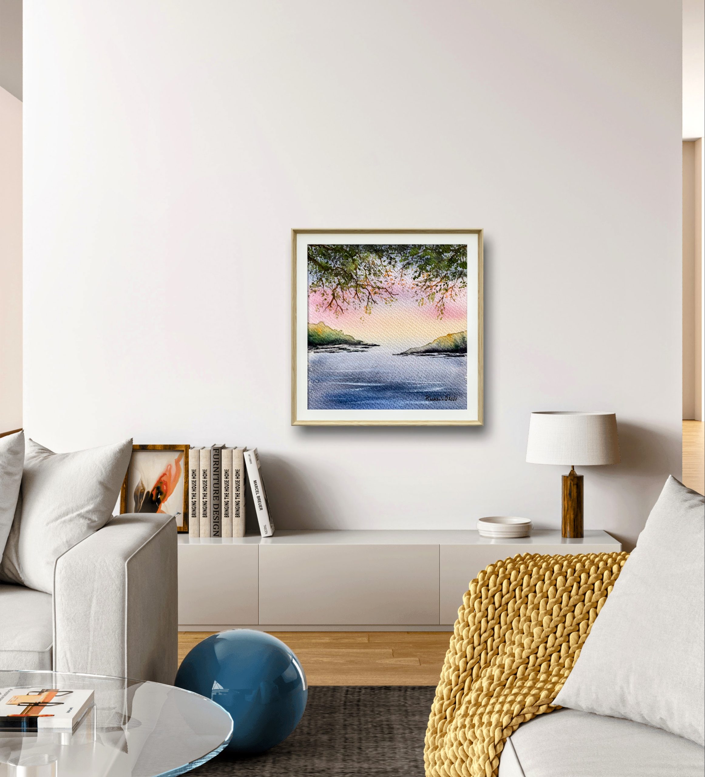 Tablou Apus pe ape- tablou pictat manual, 20x20cm