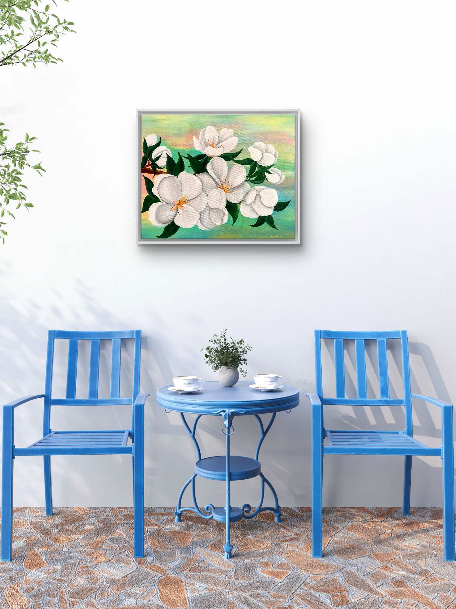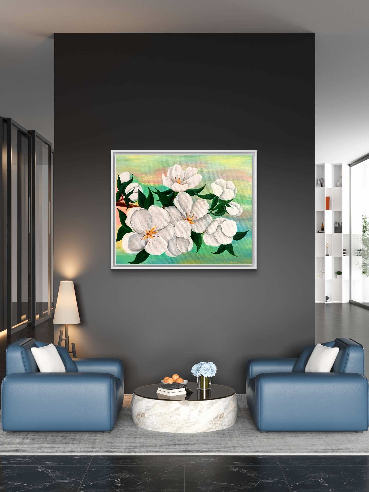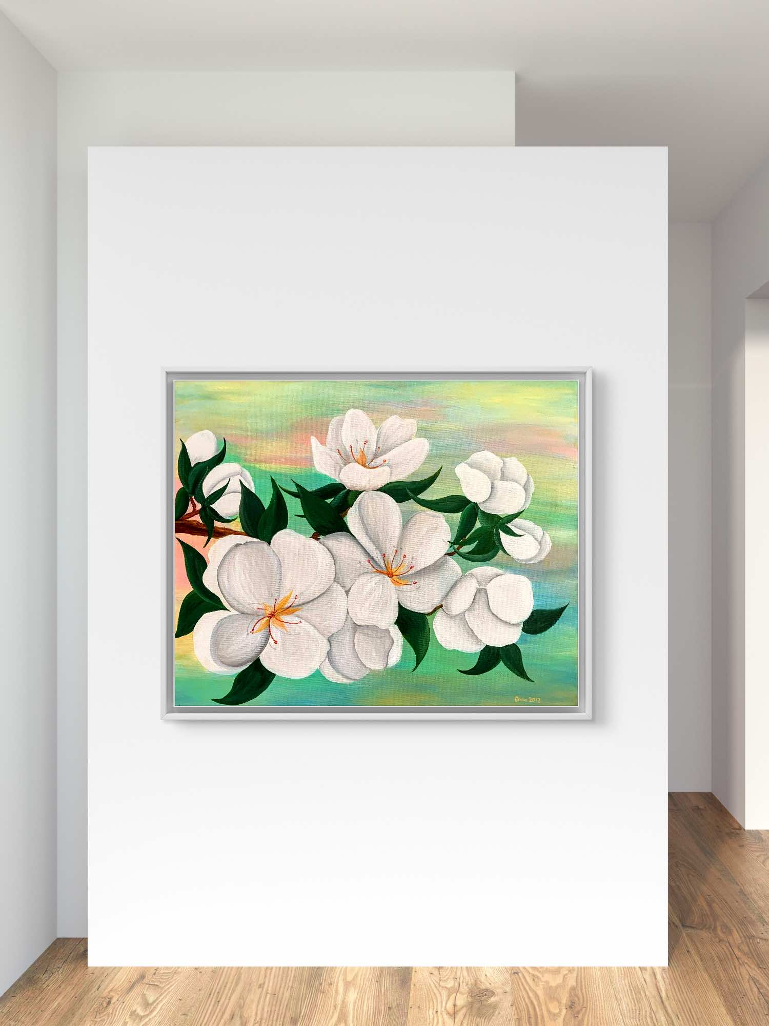 Tablou canvas Primavara Inflorita – florile mari albe pe fundal pastelat. Tabloul „Primavara Inflorita” este o creatie unica, pictata manual de Oana Pinzariu. Tabloul a fost realizat folosind culori acrilice vibrante pe canvas.