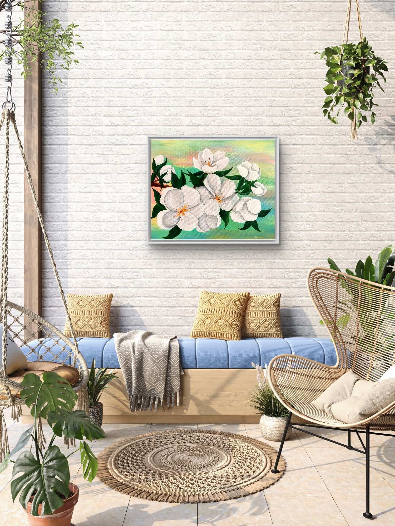 Cu dimensiunile generoase de 50×70 cm, aceasta lucrare capteaza esenta si prospetimea primaverii. Tabloul aduce un aer de naturalete oricarui spatiu. Florile albe, realizate cu o atentie deosebita la detalii. Acestea se contureaza elegant pe un fundal pastelat, evocand o stare de calm si optimism.