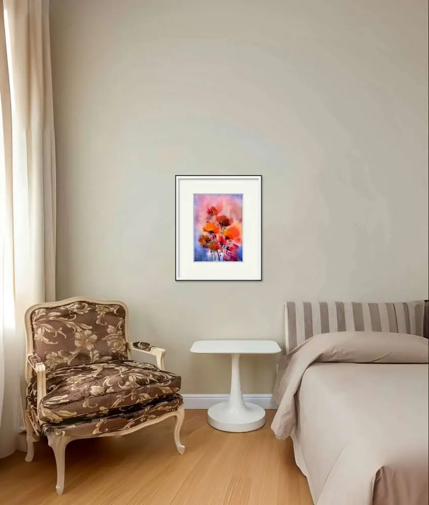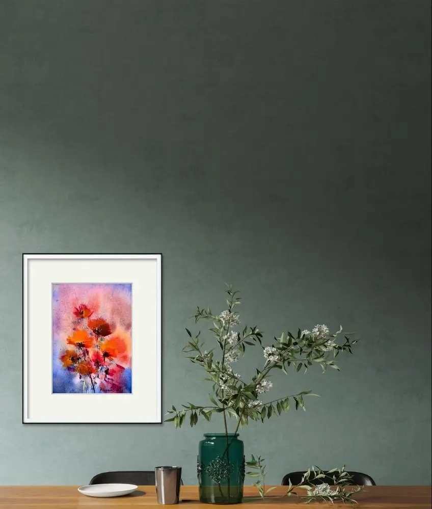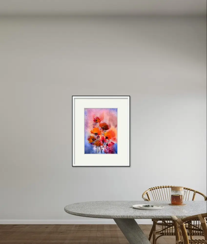 Fiecare detaliu al acestei picturi este atent lucrat, de la petalele delicate ale macilor pana la tulpinile subtiri si gratioase. Tehnica acuarelei permite o fluiditate si o transparenta a culorilor, care adauga profunzime si dinamism compozitiei. Fundalul difuz si texturat accentueaza frumusetea florilor, facandu-le sa para ca plutesc intr-un vis.