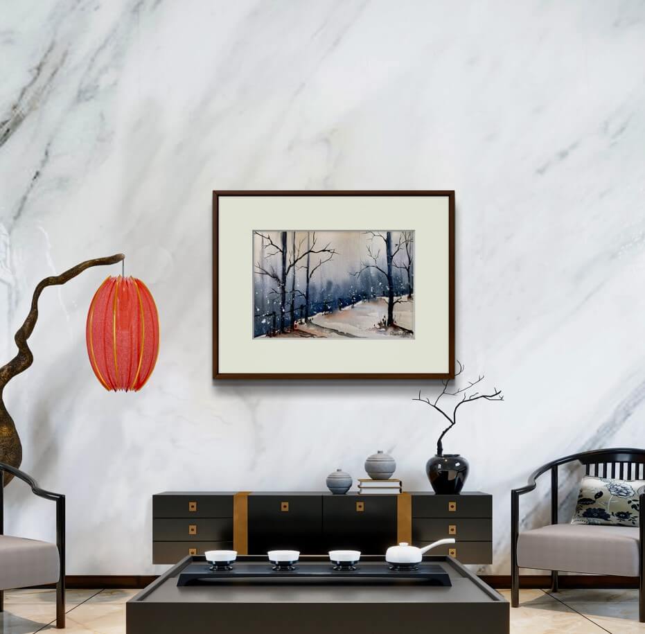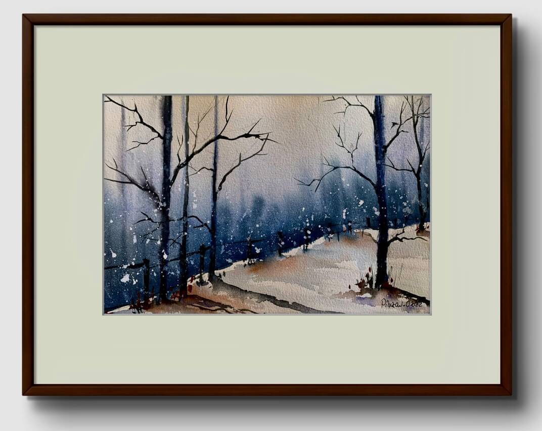Culorile reci ale iernii sunt juxtapuse cu tonuri calde, subliniind contrastul si conferind picturii o nota vie. Fiecare detaliu este pictat cu grija si pasiune, evidentiind autenticitatea si originalitatea lucrarii. Tehnica acuarelei confera picturii o atmosfera plina de viata si profunzime, prin stratificarea subtila a culorilor si jocul de lumini si umbre. Fiecare crenguta este imbratisata de un strat subtire de zapada. Copacii goi sunt invaluiti in misterul iernii.