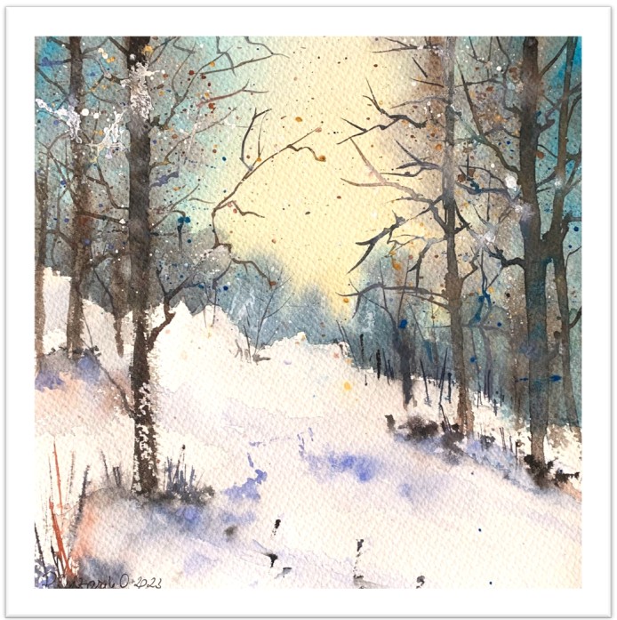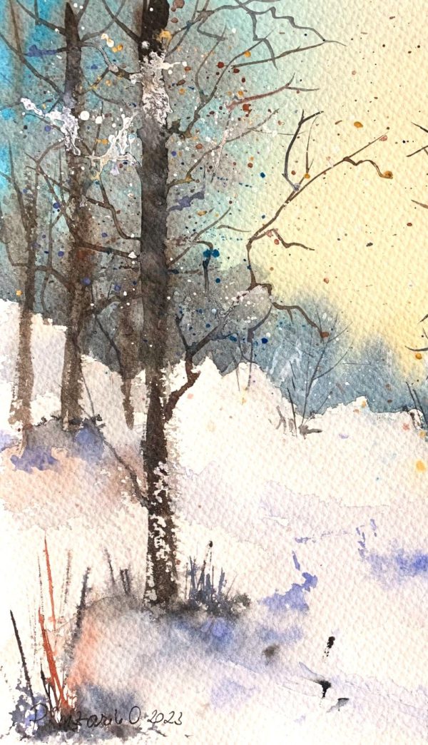 Tablou Peisajul Iernii, pictat manual in acuarela, 28x38cm