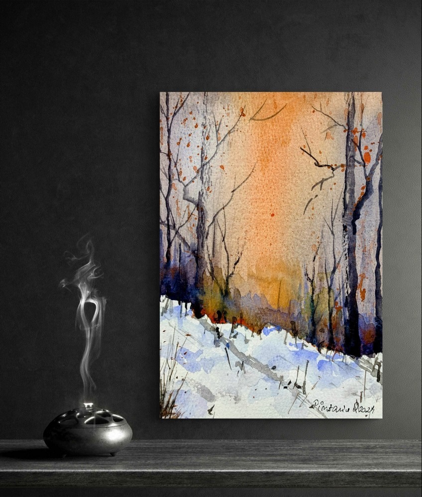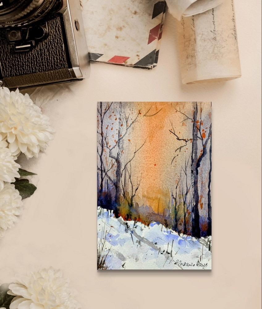 Tablou Peisaj de Iarna la Apus, pictat manual 12x17cm
