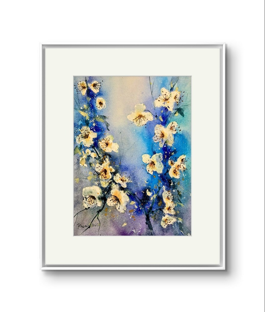 Peisaje de primavara – Tablou Flori Albe de Primavara, pictura in acuarela 28x38cm
