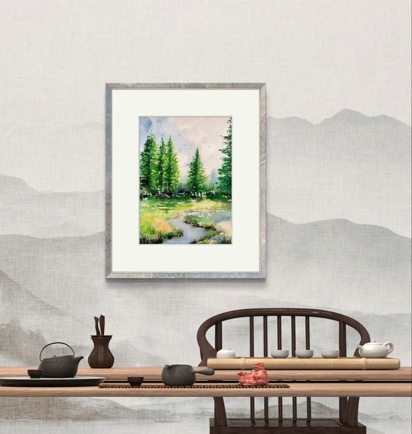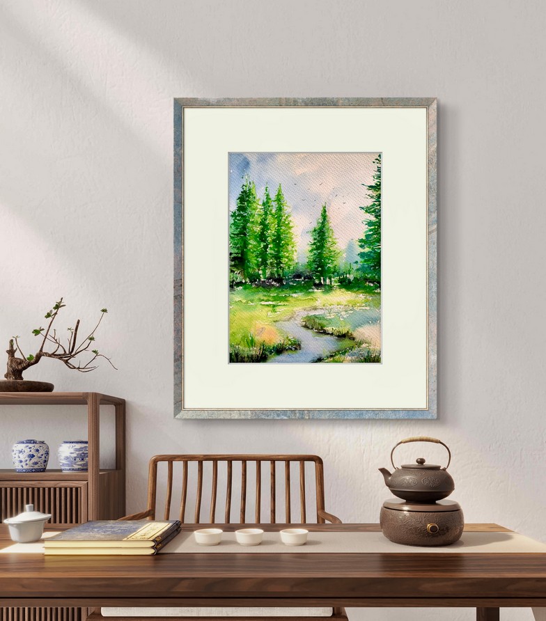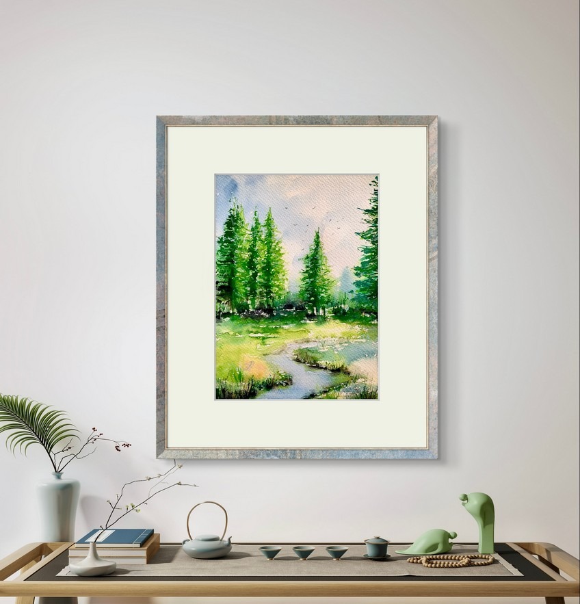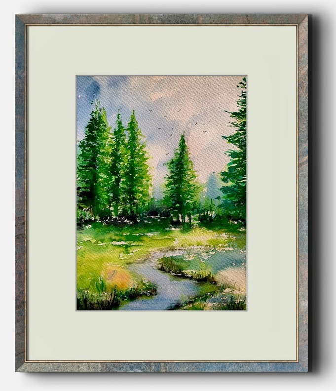Tablou Verde Smarald este un tablou pictat manual in acuarela, ce transpune in culori vibrante si detalii delicate ale frumusetii naturii prin reprezentarea brazilor. Brazi falnici se înalță spre cer, ramurile lor stufoase creând un baldachin protector de un verde vibrant. Lumina soarelui se strecoara printre frunze, picurand pete aurii pe pamantul umed. Cu o dimensiune optima de 24 * 32 cm, acest tablou aduce in prim-plan peisajul incantator al padurilor de brazi, creand o atmosfera plina de serenitate si prospetime.