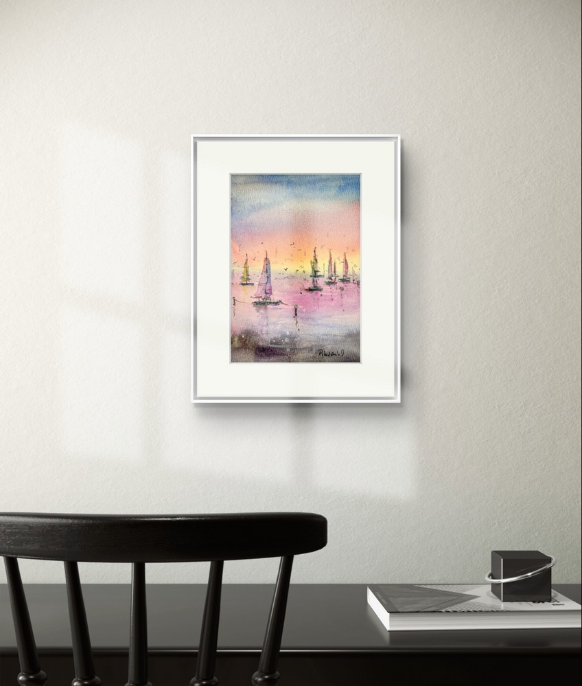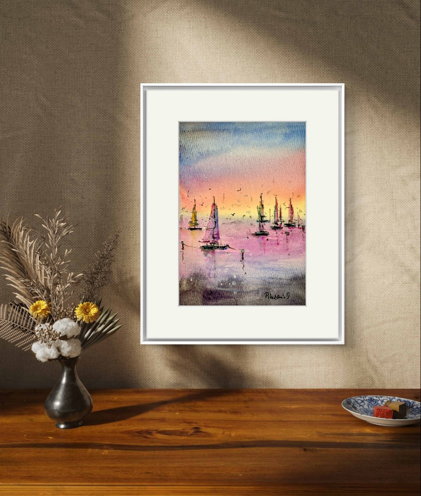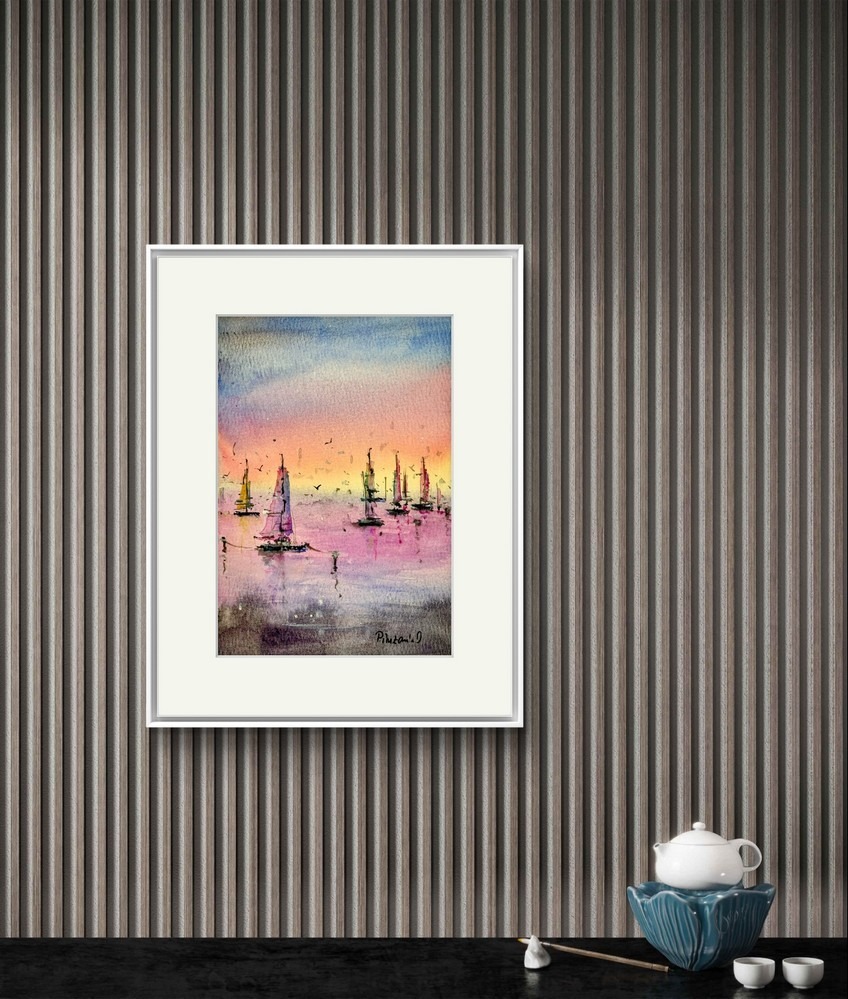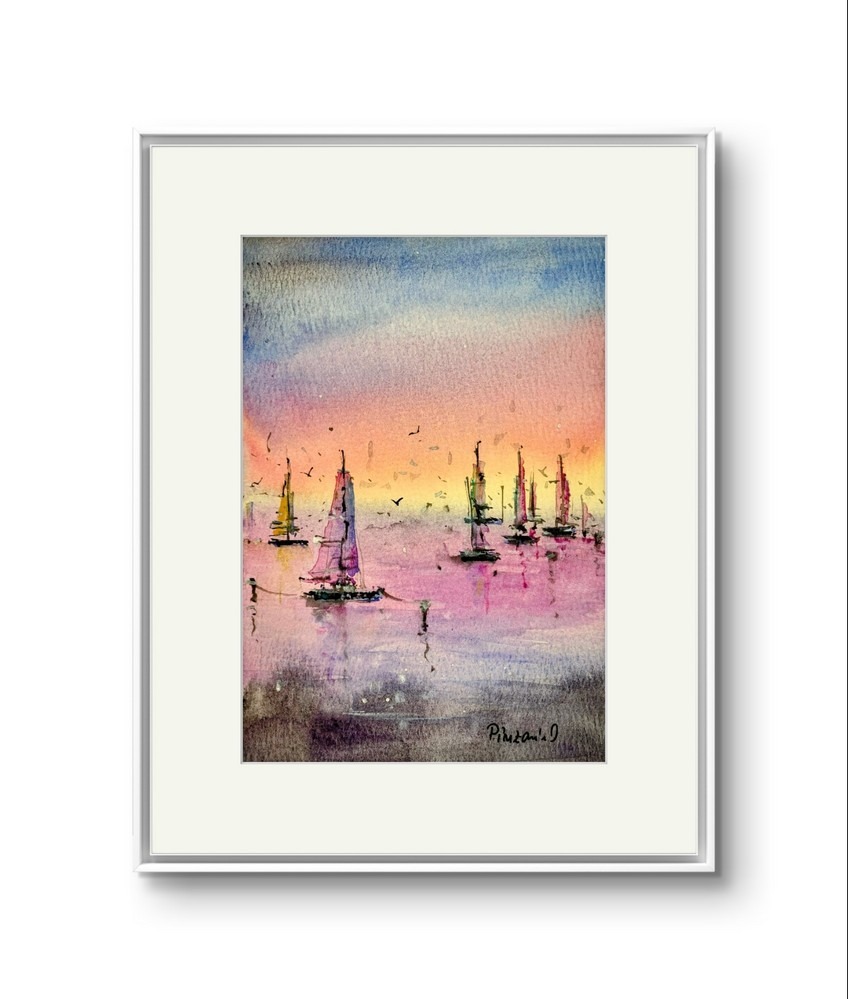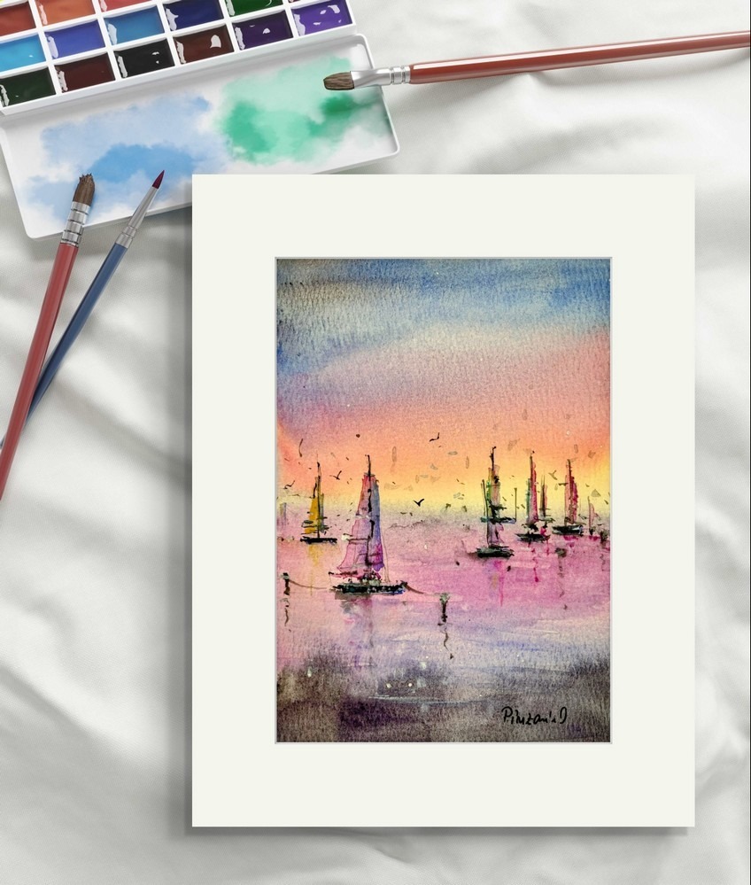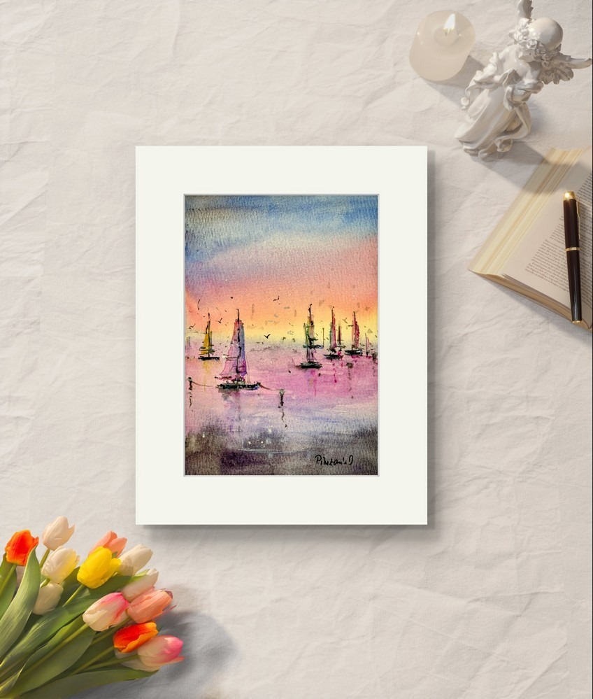 Apus Pe Marea Linistita este un tablou de peisaj marin realizat cu multa atentie la detalii.  Pictura captureaza frumusetea unei seri linistite pe apa. Dimensiunea de 12×17 cm face acest tablou perfect pentru a fi integrat in orice spatiu, oferind o atmosfera relaxanta. Pictura este realizata in acuarela pe hartie 100% bumbac de 300 grame. Hartia de bumbac este un material de inalta calitate care asigura durabilitatea culorilor si a detaliilor fine. Tabloul infatiseaza barci care plutesc in apa calma, sub cerul colorat in nuante de portocaliu, roz si albastru, iar contururile delicate ale vapoarelor creeaza o senzatie de liniste si echilibru. Aceasta opera artistica este livrata fara rama, dar include un paspartu alb, gata de a fi incadrat si expus.