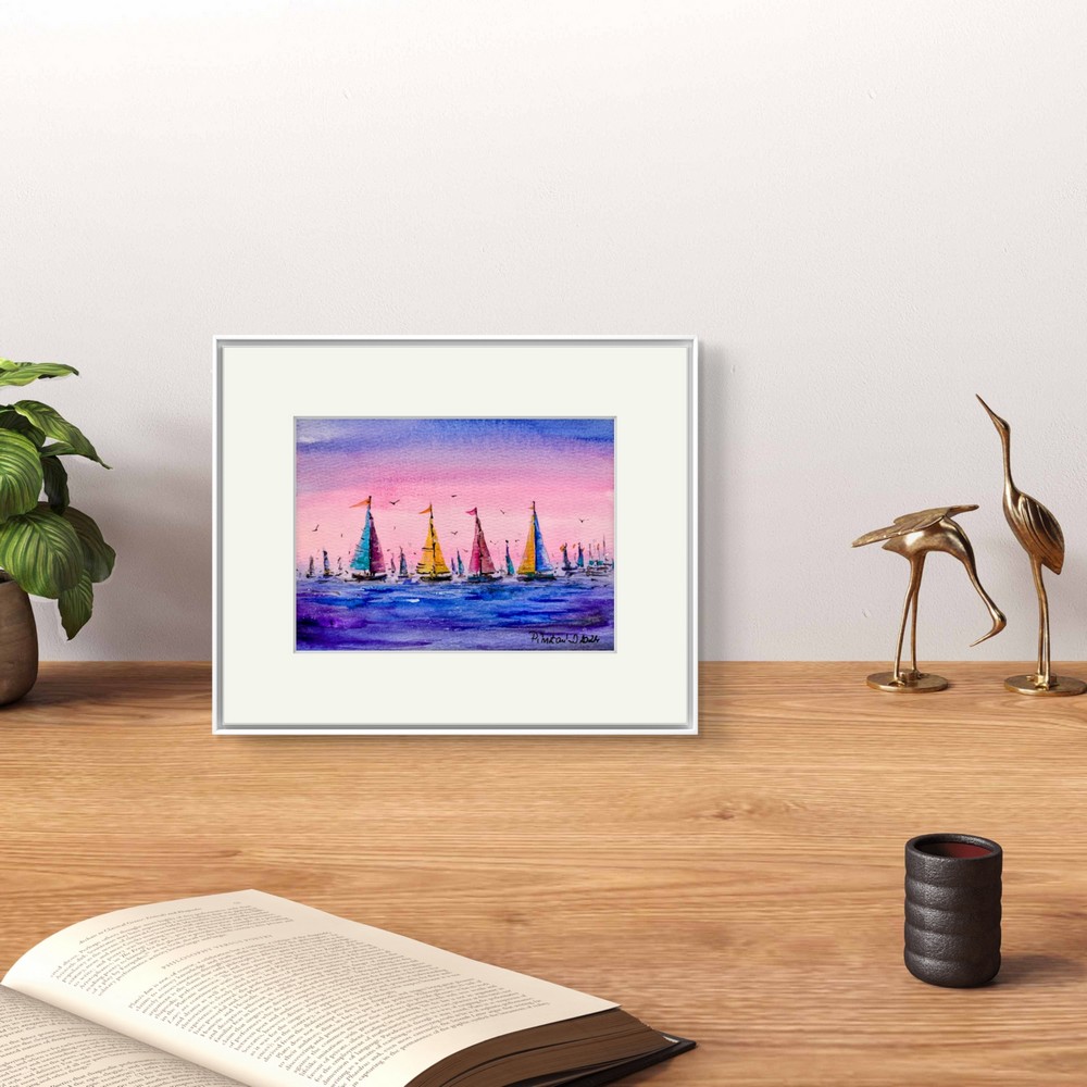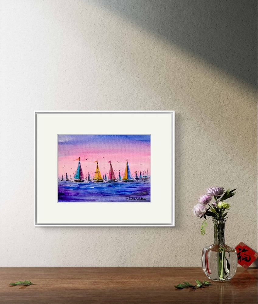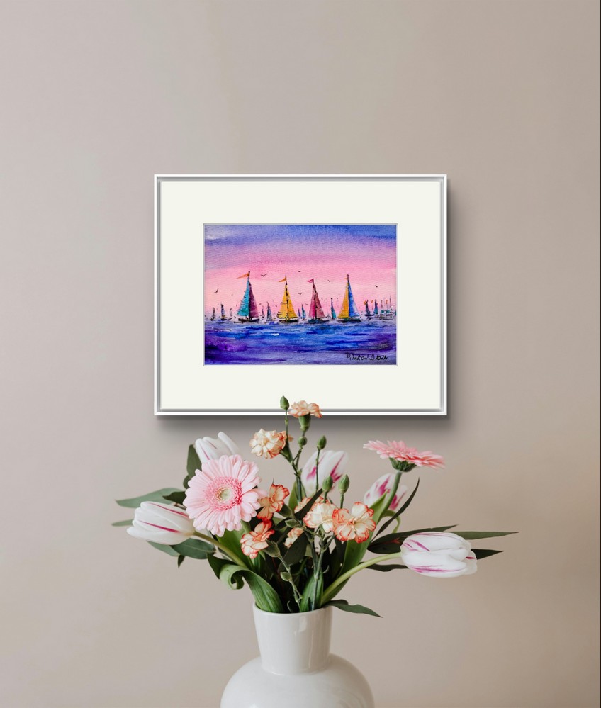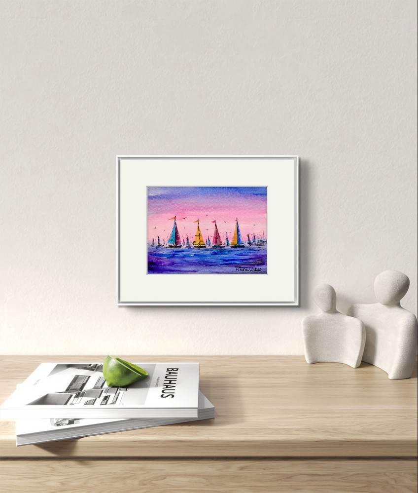 Tablou Barci colorate in amurg, pictura in acuarela 12x17cm