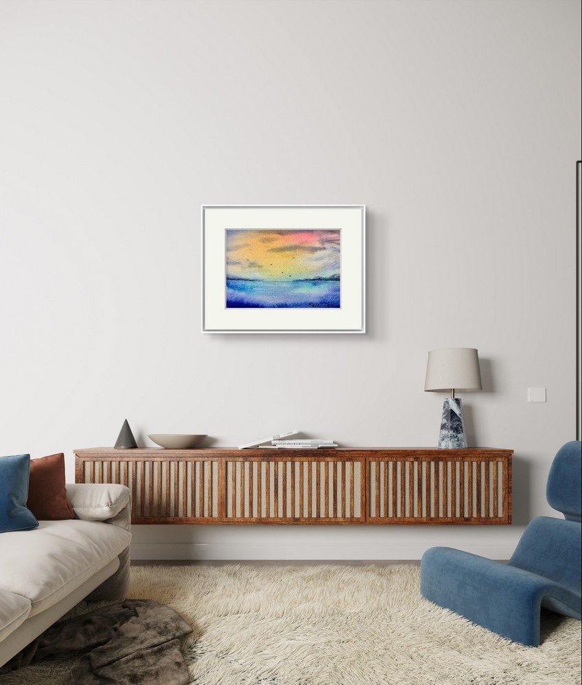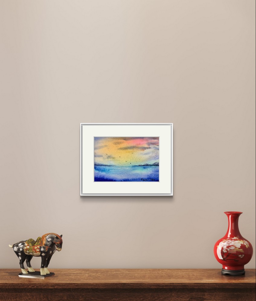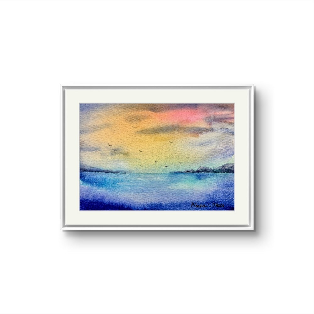 Tablou Peisaj la rasarit pe malul marii, acuarela 12x17cm