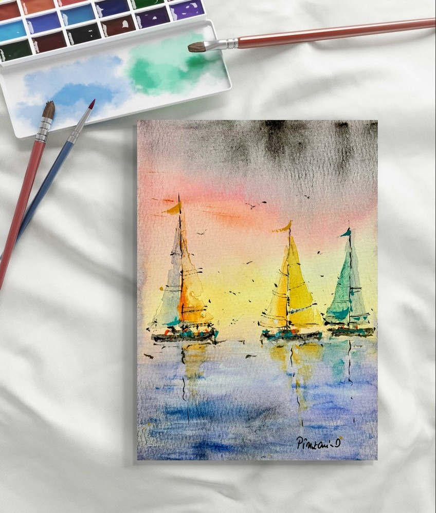 Tablou Vapoare în amurg, pictura in acuarela 12x17cm