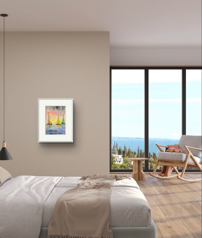 Tablou Vapoare in amurg – Aceasta pictura in acuarela surprinde vapoare navigand intr-un peisaj maritim dominat de lumina calda a apusului. Atmosfera este una de liniste, unde cerul in nuante de portocaliu si galben se reflecta delicat pe suprafata apei. Fiecare detaliu al vapoarelor este realizat cu o atentie deosebita. De la conturul simplu al corpurilor pana la velele care capteaza ultimele raze ale soarelui. Acest tablou invita privitorul sa se piarda intr-un moment de contemplare a naturii si sa experimenteze linistea unui apus pe mare.