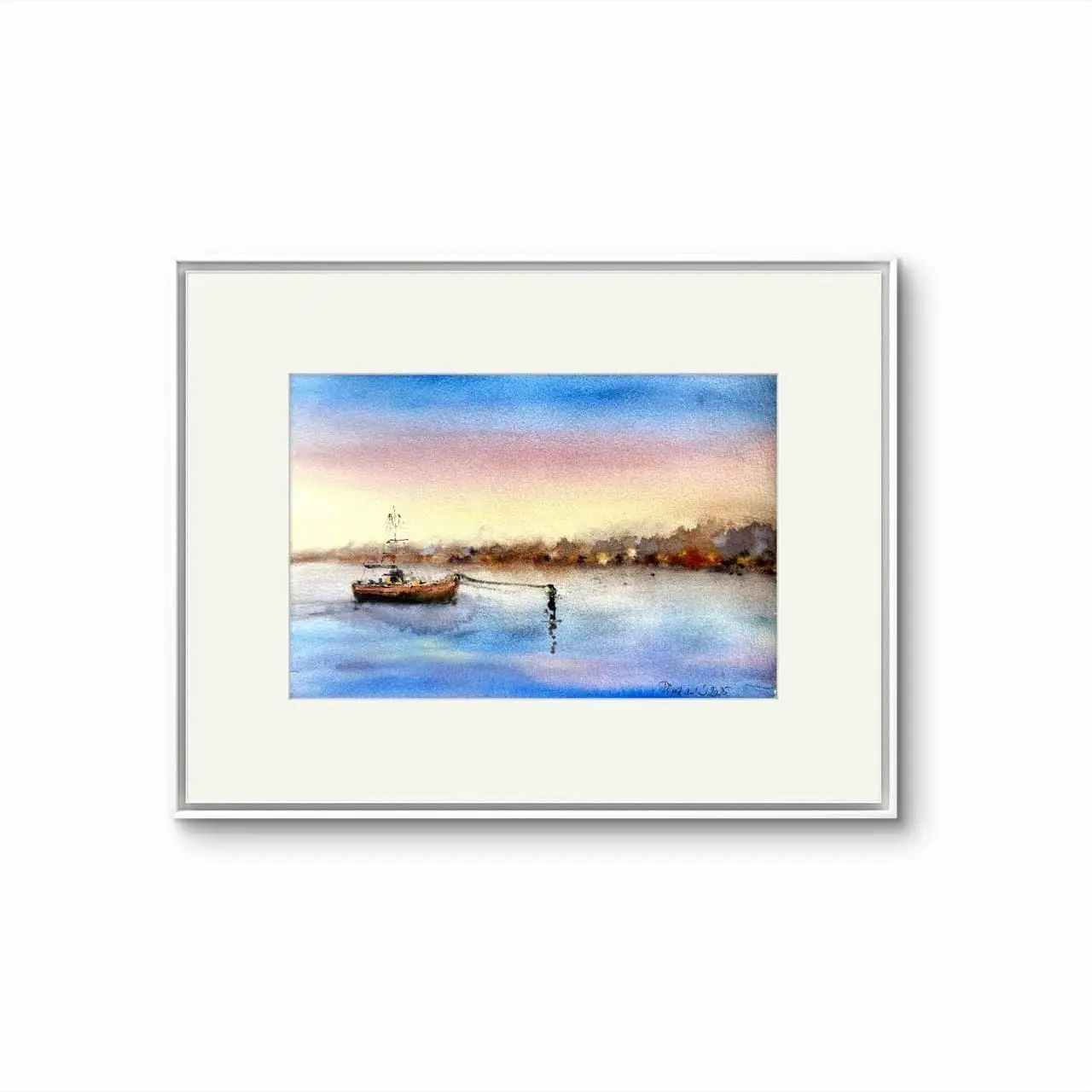 Tablou Vas ancorat la apus, Pictat manual, acuarela 28x20cm