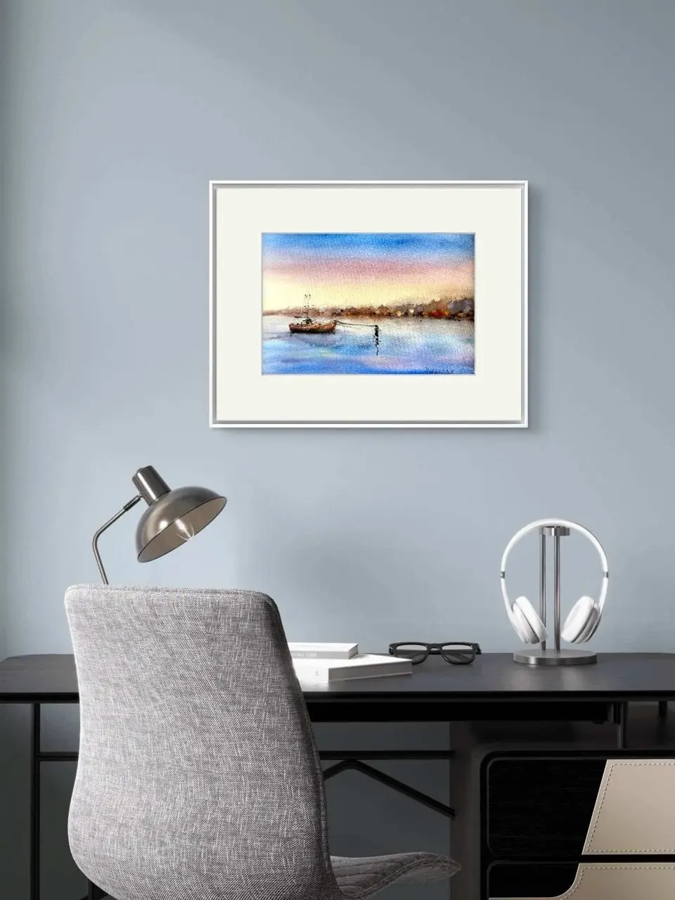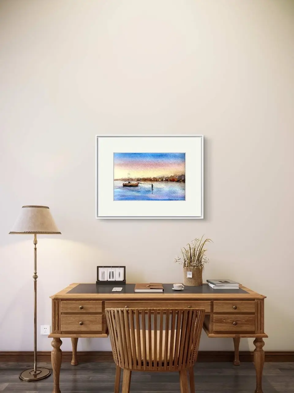 Tablou Vas ancorat la apus este o pictura deosebita ce surprinde frumusetea si calmul unui peisaj marin pictat. In aceasta acuarela, un vas elegant stationeaza pe ape linistite, inconjurat de un cer vibrant in nuante de albastru si roz. Atmosfera creata de reflexiile apei si siluetele discrete ale fundalului ofera privitorului o senzatie de relaxare si contemplare.
