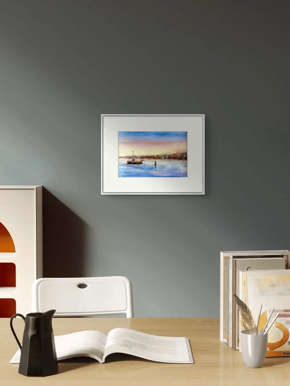 Tablou „Vas ancorat la apus” surprinde frumusetea si linistea unui peisaj marin pictat in acuarela. Vasul elegant, odihnit pe ape calme, este invaluit intr-un cer vibrant in nuante de albastru si roz, creand un tablou ce inspira relaxare si contemplare. Aceasta pictura se potriveste perfect in orice decor, fie ca este un living modern sau un dormitor elegant, aducand un strop de rafinament si armonie. O alegere ideala pentru iubitorii de arta si cadouri unicat.