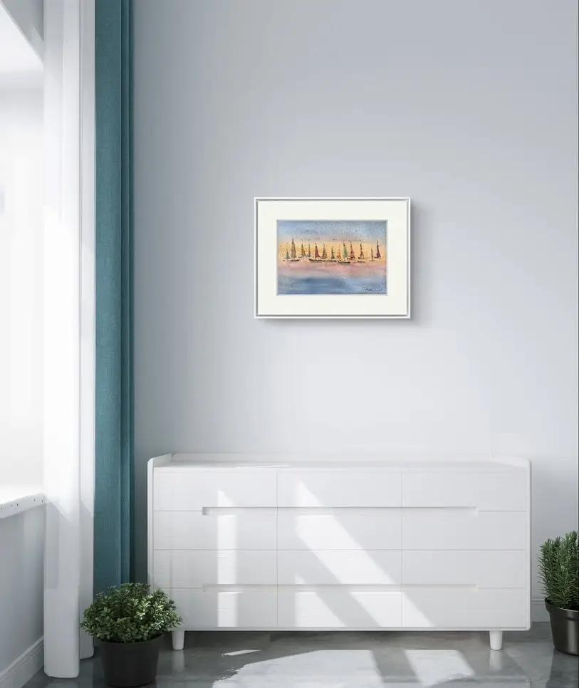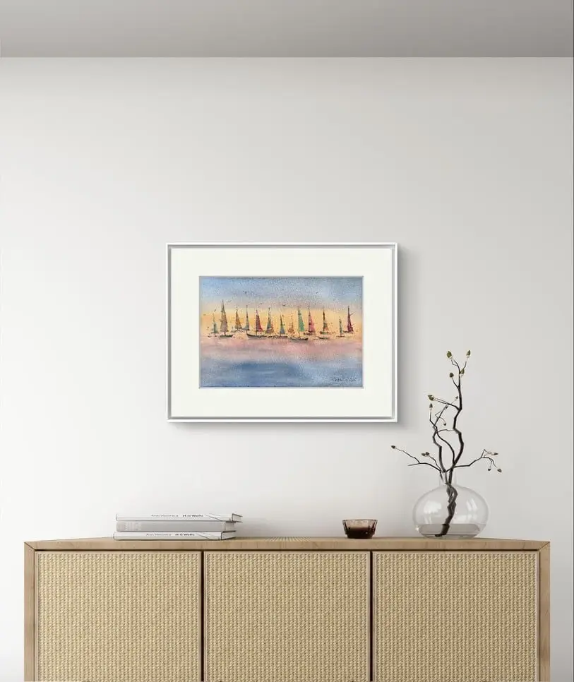 Tablou Vele în lumina apusului – Adauga o nota de calm si eleganta in decorul casei tale.  Pictat in acuarela – Vele in lumina apusului, reprezentand un peisaj marin cu barci sub cer pastelat in nuante de apus. Peisajul surprinde un grup de veliere delicate, in culori vibrante si contrastante, plutind lin pe apa calma, reflectand lumina calda a apusului. Cerul colorat in portocaliu, roz si albastru se regaseste in reflexiile sale spaciale in apa. Astfel s-a creat o atmosfera atat de relaxanta, incat pare ca ai fi chiar pe malul marii.